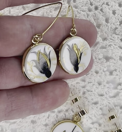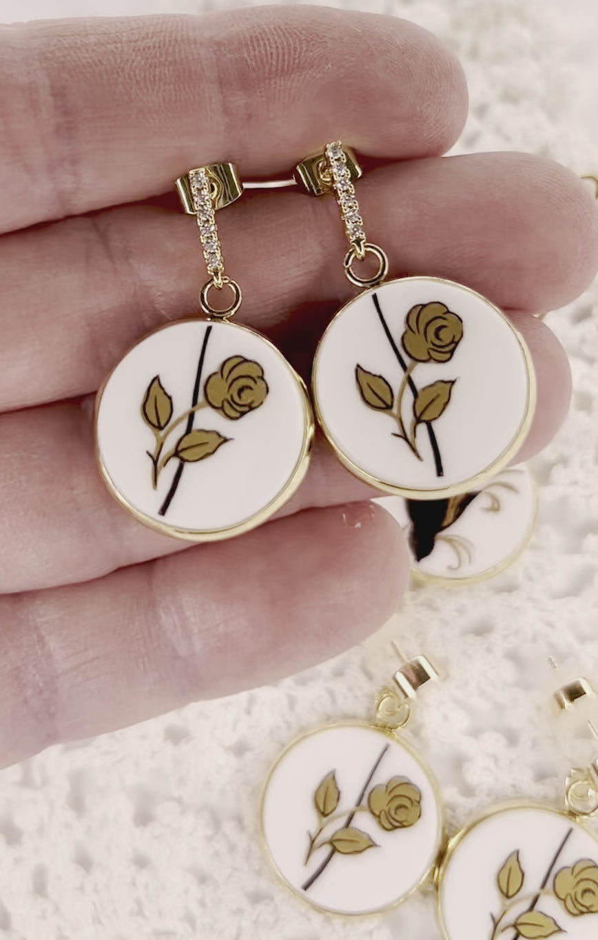 These dangly earrings have been rescued from a damaged Elizabethan China plate - Circa 1960’s. They have been hand cut, hand sanded and sealed before being set in this gorgeous yellow gold tone. They are all hypoallergenic. The plate itself measures approx 18mm across. There may be minor wear, which is to be expected with their age, but that adds to their unique one-of-a-kind beauty.